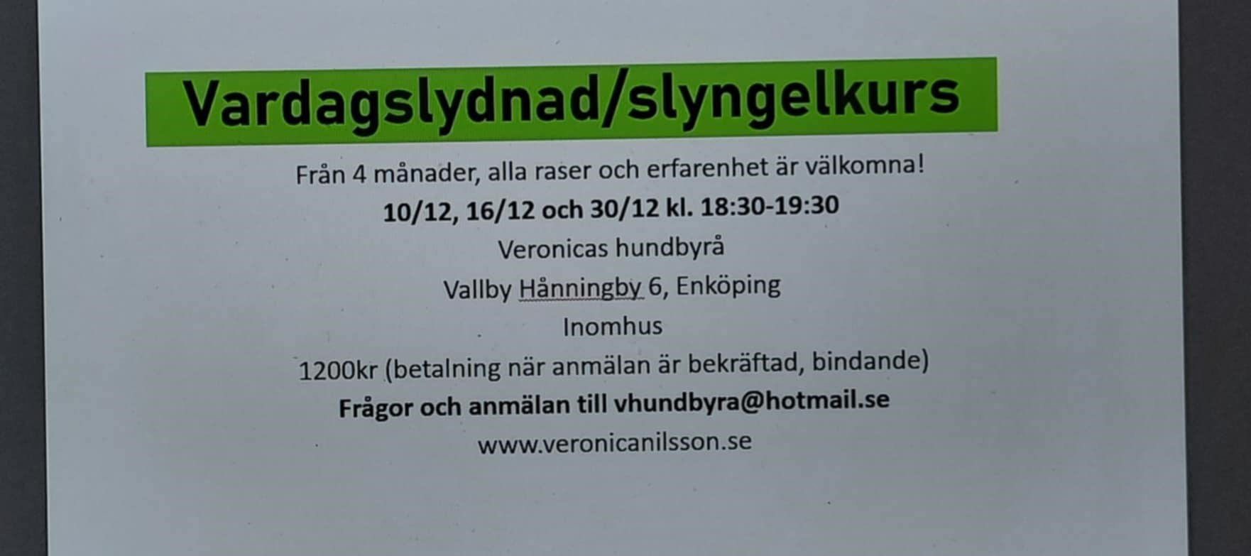 Vill du veta mera eller anmäla dig, maila vhundbyra@hotmail.se (Veronica)